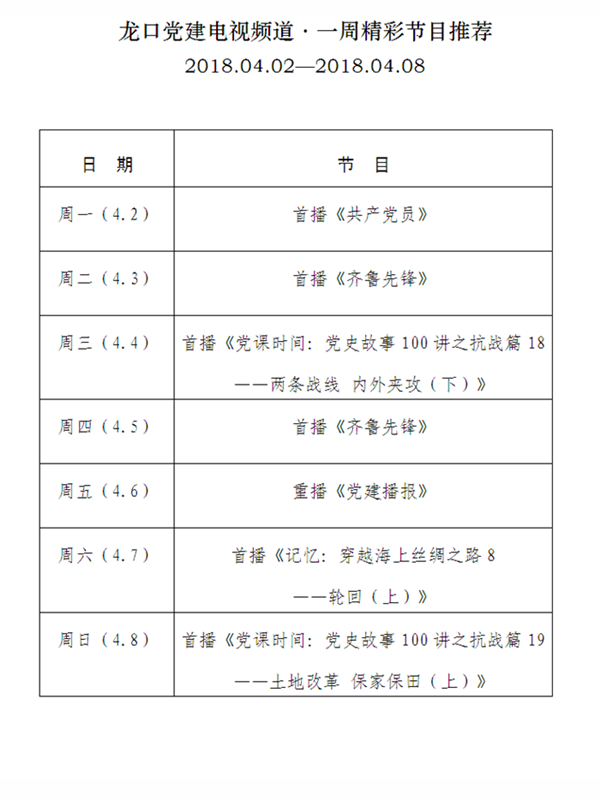 龙口党建电视频道节目推荐4月2日-4月8日